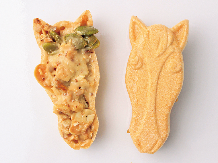 相馬市中村の菓子店『松林堂』の「うま家老」は、キャラメルにカボチャの種やアーモンド、クルミなどのナッツ類を混ぜ、最中の皮に入れて焼き上げた。キャラメルとナッツのザクザク食感を楽しんで。