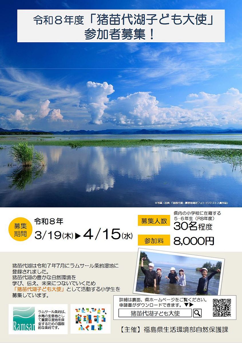 - 2026.03.19(木) 令和8年度「猪苗代湖子ども大使」参加者募集のお知らせです。