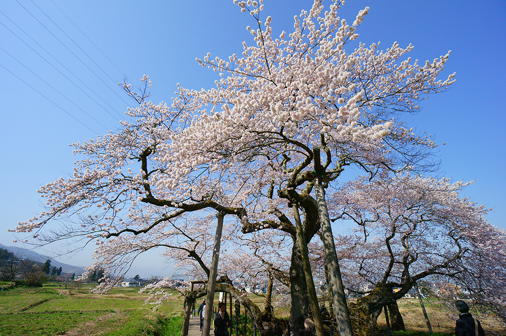 This is one of the Aizu region’s most iconic solitary cherry trees — an “Edo-higan” sakura estimated to be around 650 years old. It is said to have once stood in the garden of samurai Ishibe Jibu Dayū of the Ashina clan, which ruled Aizu during the medieval period. Surrounded by open farmland, it is particularly striking when in full bloom. With its ten trunks and branches spreading to roughly 20 meters, it presents a truly majestic sight.