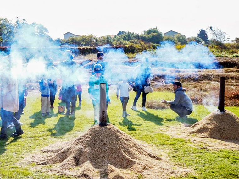 焼き芋をもみ殻でじっくり蒸し焼きに。もみ殻の焼けた匂いを体感してみて。