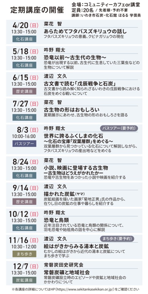 いわき市石炭・化石館ほるるでは、月1回「定期講座」のほかにも、まち歩きや講演会などを開催しています。関心のあるイベントがございましたら、ぜひご参加ください。