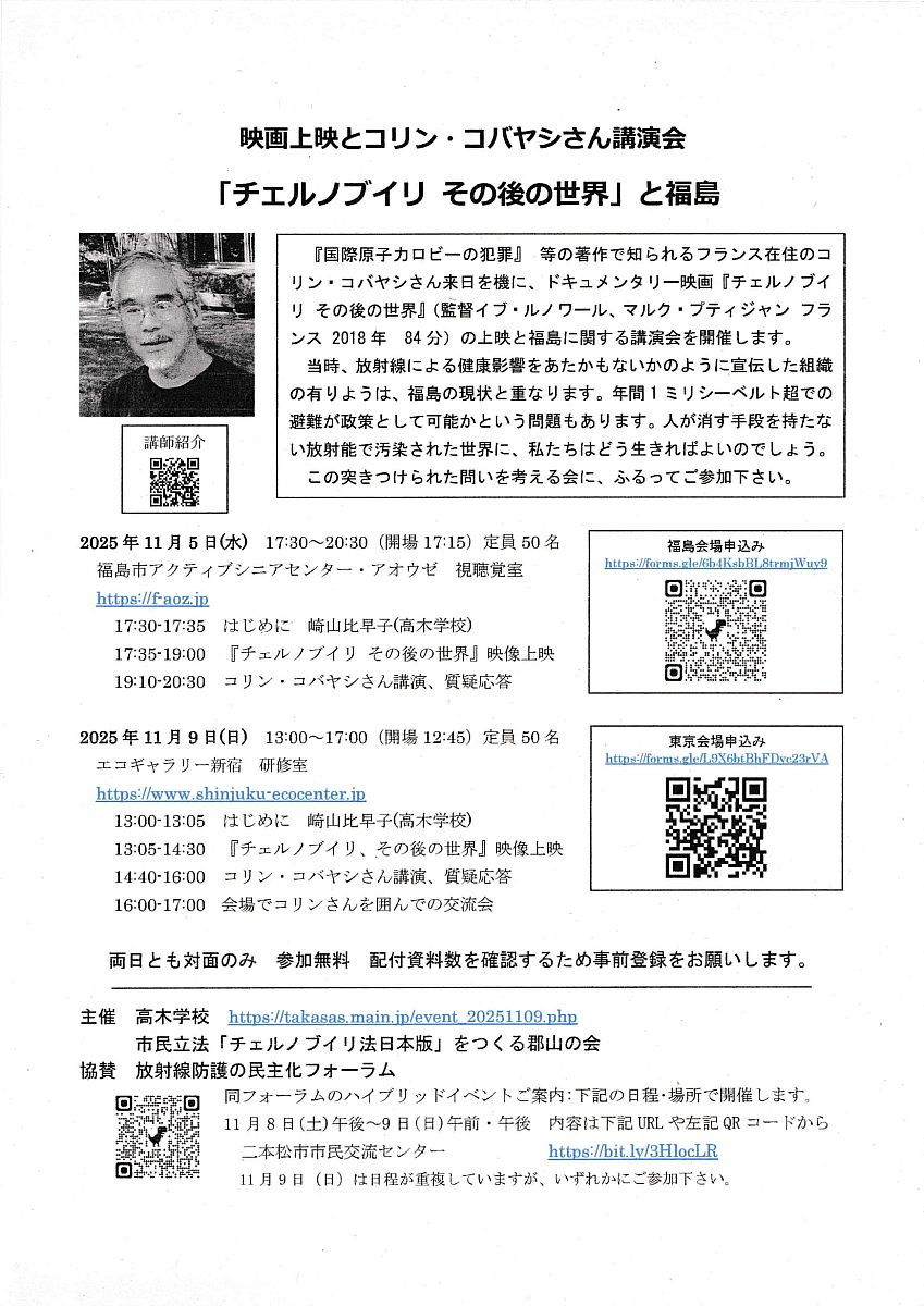 『国際原子カロビーの犯罪』等の著作で知られるフランス在住のコリン・コバヤシさん来日を機に、ドキュメンタリー映画『チェルノブイリその後の世界』(監督イブ・ルノワール、マルク・プティジャン フランス 2018年84分)の上映と福島に関する講演会を開催します。