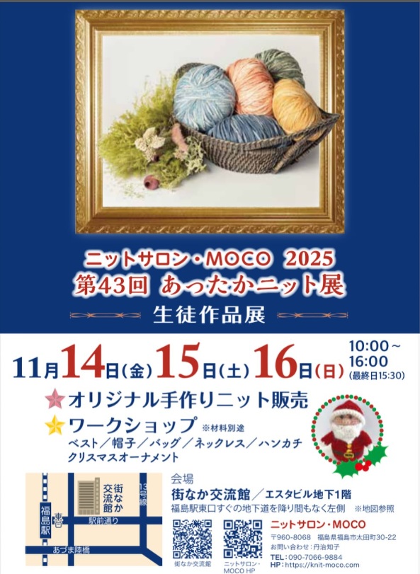 2025年11月14日(金)~16日(日)の3日間、福島市の街なか交流館で、ニットサロン・MOCOによる「第43回 あったかニット展」が開催されます。