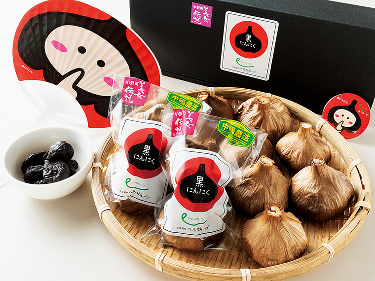 小野町のにんにくは土壌を細かく分析し、適切なミネラルを補いながら健康的な土づくりをすることからはじめ栽培される。収穫後は約1ヵ月かけて乾燥し、熱を加えて熟成。独特な柔らかさとまるで黒糖のような甘さを引き出す。