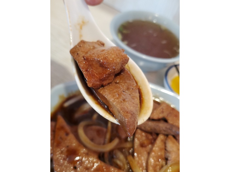 なるべくタレを纏わせようとれんげをお借りしたら、ひたひたのレバーを顔前まで持ってきて最短距離で口まで移送。