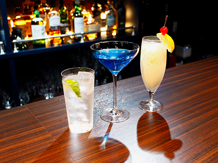 左から「ジントニック」「スカイダイビング」「ピニャコラーダ」のカクテル。