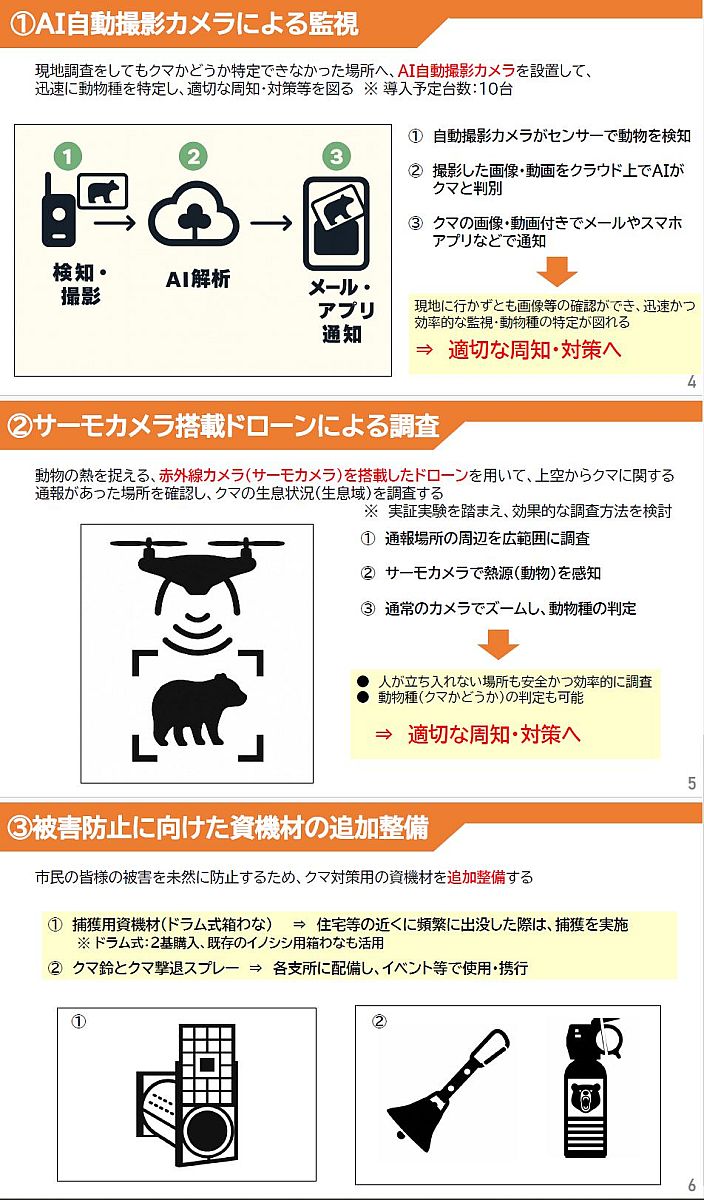 いわき市では、市民の安全確保と被害の未然防止を目的として、令和7年10月に「いわき市・ツキノワグマ被害防止プラン」を策定し、注意喚起を行っています。これまで、ツキノワグマ(以下「クマ」という。)による被害は発生していませんが、クマに関する通報が多数寄せられており、現地調査を実施しているものの、痕跡が確認できずクマと特定できないケースが多く、不安が払拭されていない状況です。このような状況を踏まえ、市民の安全・安心を確保する観点から、プランの第2弾(追加対策)を実施することとしました。(いわき市環境企画課)