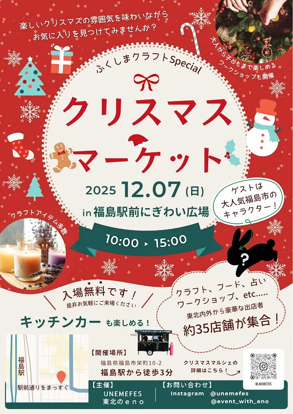 ハンドメイド、ワークショップ、占い、マッサージ、キッチンカー、お菓子販売、ドリンク販売などなど!2025年頑張ったご褒美に楽しいクリスマスの準備をマルシェで揃えましょう!ワークショップも開催します。スペシャルゲストに福島市のあのウサギのキャラクターが登場!お子様と一緒に撮影を楽しみましょう。