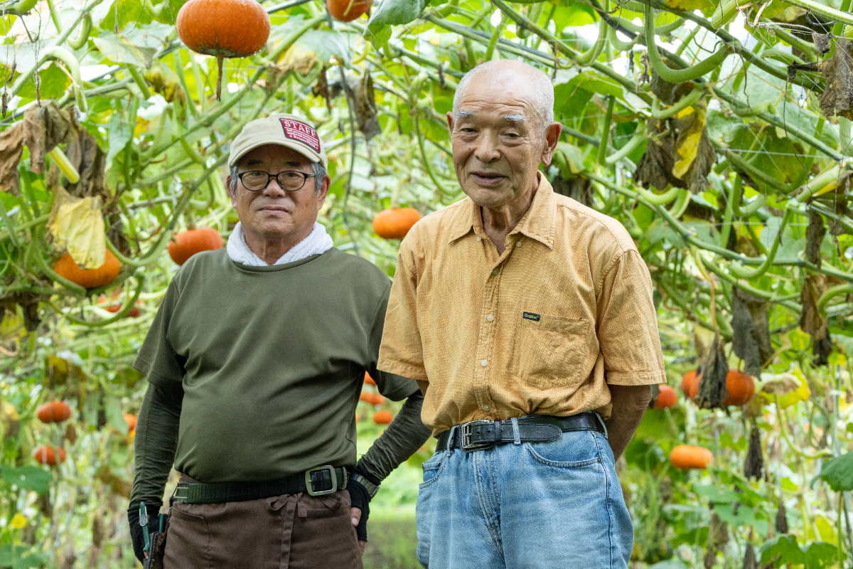 あまりのおいしさから人気の的となっている「奥会津金山赤カボチャ」。生産者協議会会長の青栁(あおやぎ)一二(いちじ)さんと副会長の渡部(わたなべ)真明(まさあき)さんは、生産農家、生産量を増やすだけでなくおいしさにこだわり続け、さまざまな加工品作りにも関わってきました。