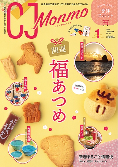 福島県のタウン情報誌「CJ Monmo」1月号の特集は、心と運気を整える開運スポットや、福島市・郡山市での「福」を探すまち歩きをご紹介。午年にちなんだ馬肉グルメ、いわき市で昔から愛される「うまかたようかん」など新年に味わいたいグルメも。