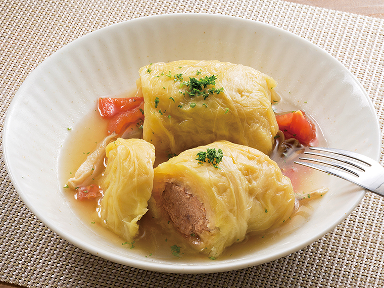 雪掘キャベツを重ねて国産牛と和豚もち豚の合いびき肉を丁寧に包んで仕上げた『河内屋』の「雪掘ロールキャベツ」(3,500円)は、会津地鶏のダシを使った「コンソメ」と本格的で濃厚な味わいの「デミグラス」の2種類から選べる。