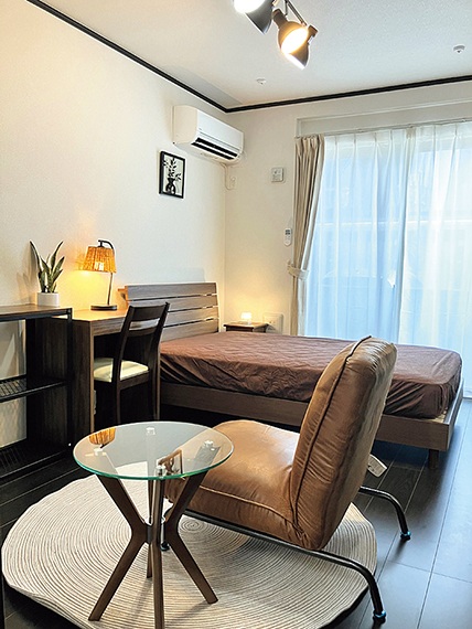 左下の写真は、マンスリー物件の一例。家具家電完備で、カバン1つで生活を始められるのも魅力。