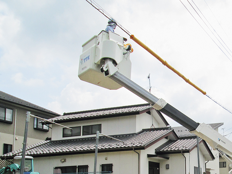 屋外での電気通信設備工事では、高所作業車を使い、安全かつ確実に構築・保守・ 点検・修理など行う。