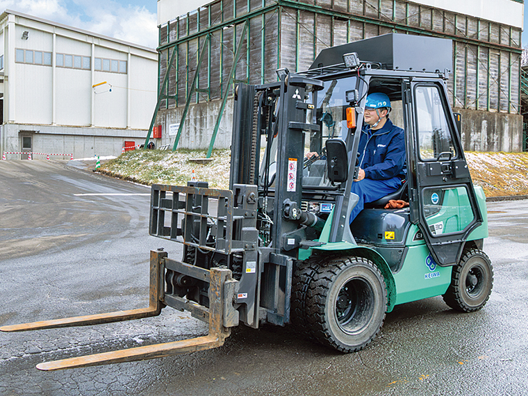 下の写真は、福島工場でコンテナを運ぶフォークリフトを操作する蓬田さん。各種重機の免許取得は、入社後に会社がサポートする。