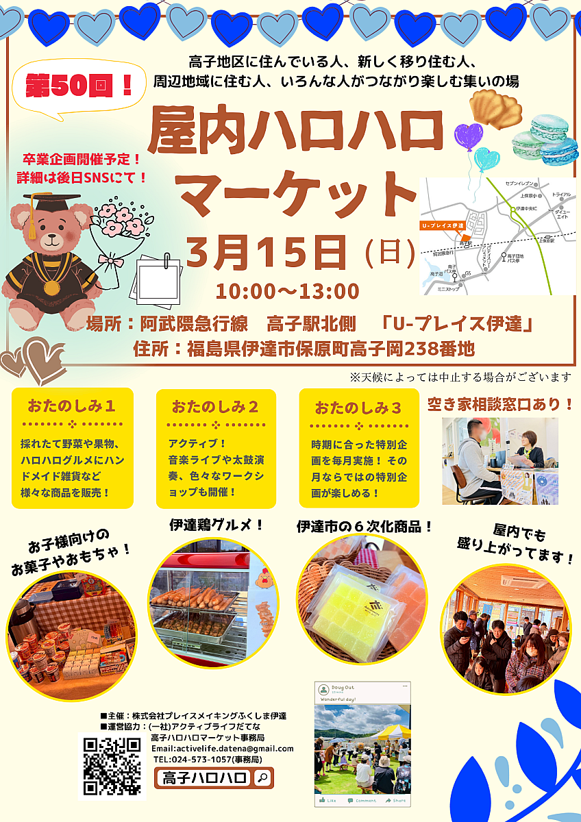 今月は「屋内ハロハロマーケット」として、3月15日(日)に、伊達市保原町の「U-プレイス伊達」で開催します。「卒業企画」も予定していますので、ぜひお出かけください。