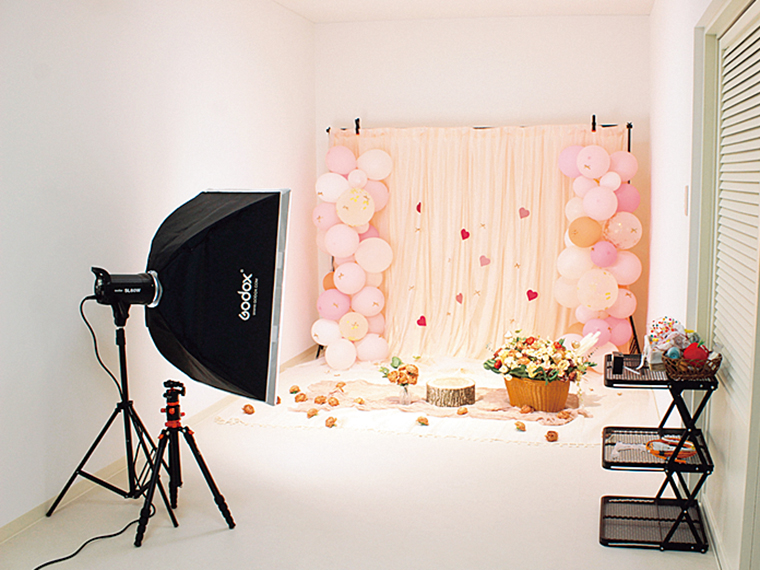 白を基調とした清潔感のあるスタジオで、季節ごとに背景のセットや風船の装飾が変わる。完全予約制、ロケーション撮影も可能