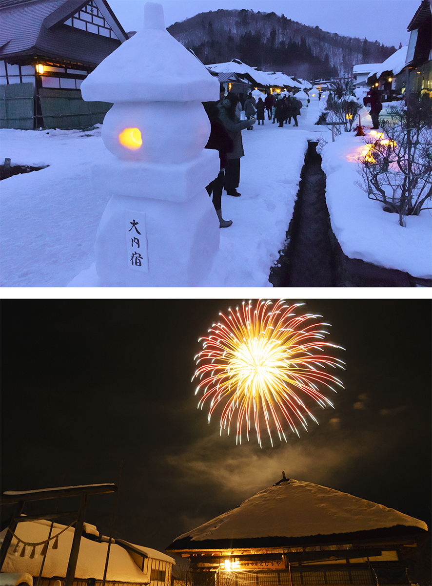 行事の後には打ち上げ花火が始まり、集落の人々や近隣からの来訪者、観光客がみんな冬の夜空を見上げていました。雪灯籠のイルミネーションが夜まで行われたため、それを見に訪れた人も多く、帰り道では大内宿へ向かう対向車が多く、少し混んでいたようです。中通りへ戻る途中、トンネルを抜けると雪のない景色が広がりました。雪に包まれた大内宿で過ごした一日は、どこか異世界のような体験でした。大内宿雪まつりに興味を覚えた方は、来年ぜひ下郷町へ足を運んでみてください。