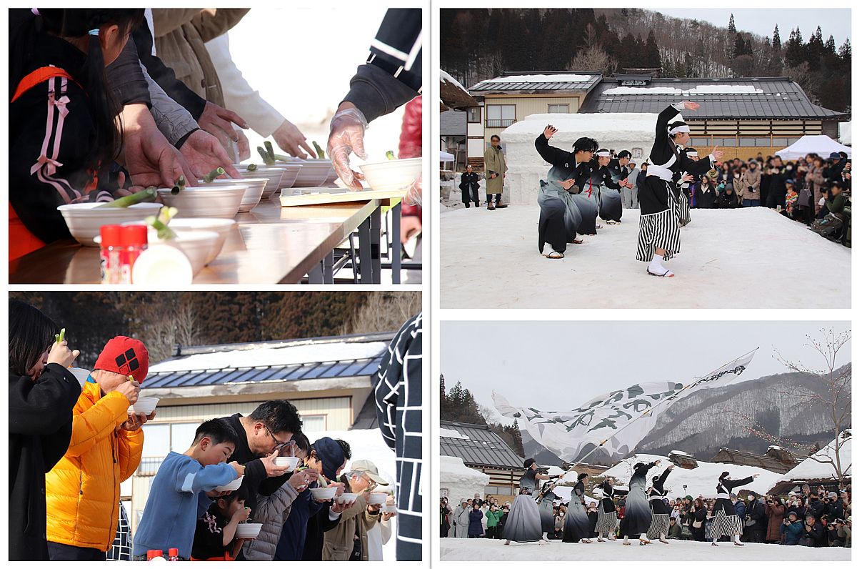 The program opened with “dango-sashi,” a traditional ritual in which visitors stepped onto the stage and skewered rice dumplings onto tree branches. The custom has long been practiced across the Minamiaizu region, and people of all ages took part with ease. I first assumed the dumplings might be made of clay – they looked decorative and there were so many of them. In fact though, they were real, edible rice cakes, which made the scene feel even more authentic. After the opening ceremony, the stage was used for a “kuji-mochi” giveaway. Staff climbed onto the roofs of the snow storehouses beside the stage and tossed rice cakes down to the crowd. I have seen mochi handed out before, but watching it rain from above was new to me and reminded me of Setsubun, the festival with the tradition of bean-throwing.
