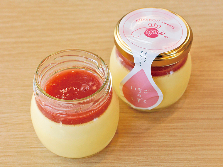 田村市都路町の『MIYAKOJI sweets YUI(みやこじスイーツゆい)』が提供する、「都路たまご」の卵黄と生クリームを使ったなめらか食感が魅力の「ゆいプリンリッチ」。その上に地元産のいちごを用いたソースをかけた。プリンの濃厚な味わいに、いちごの爽やかな甘みが加わり、まさに口福。