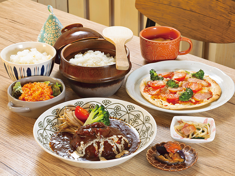 いわき市平の『Delica Cafe Kibaco(キバコ)』は、木のぬくもりがある半個室で日常を忘れてくつろぐことができる。看板メニューは、ハンバーグをメインにした3種類のランチコース。「カジュアル」は写真の料理(ピザをパスタに変更可)に、デザート1種類とコーヒーまたは紅茶が付く。