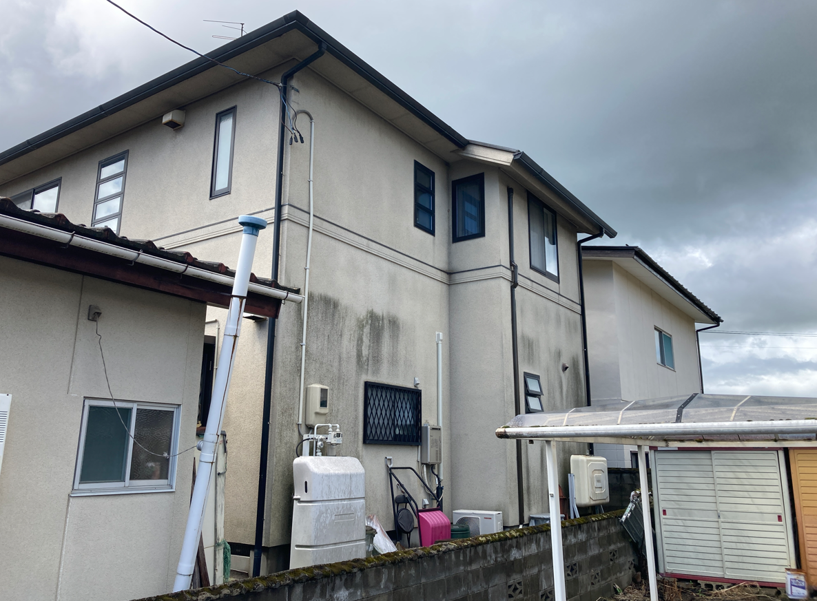 ご相談いただいたお住まいでは、日当たりの少ない北側外壁を中心に、茶色く見える苔・カビ汚れが目立ち始めていました。また、地震による細かなクラック(ひび割れ)が外壁全体に多数発生している状態でした。