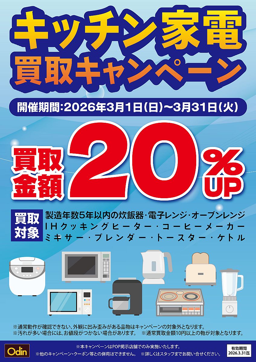 - キッチン家電買取キャンペーン オーディン福島矢野目店で開催中!!3/31まで(東都クリエート株式会社)- 2026.03.25(水) 10:29