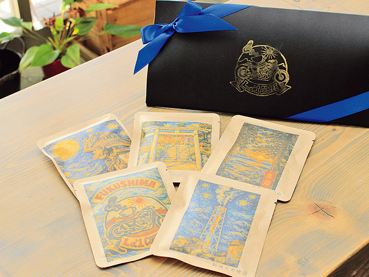 「La'1 COFFEE(ライチコーヒー)」の自家焙煎コーヒードリップバッグ(1個250円)。ギフトセット(3個850円・5個1,350円)は要予約。新地町の景色をゴッホ風にデザインしたパッケージが特長。