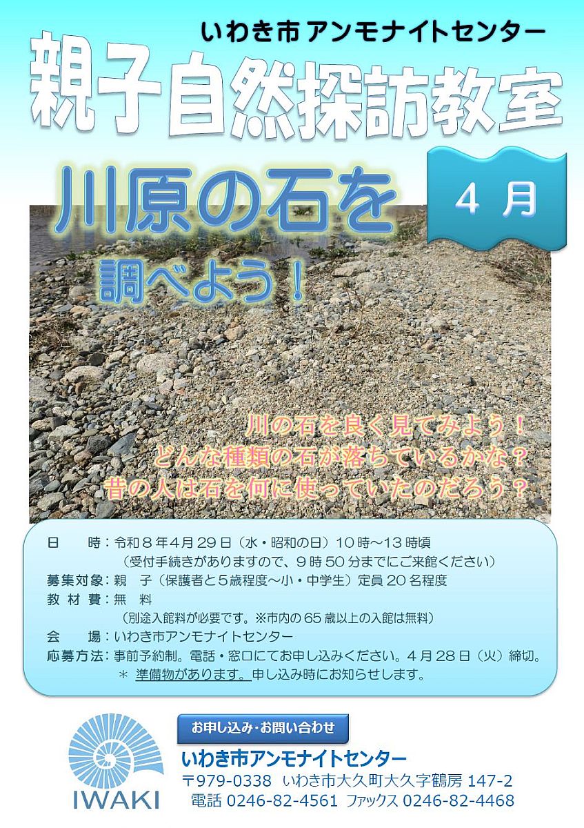 いわき市アンモナイトセンター 親子自然探訪教室「川原の石を調べよう!」4/29開催!