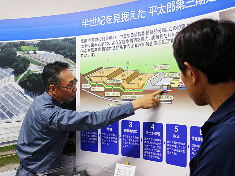 まずは、会社にある展示スペースで最終処分場はどのようなものかお話を聞きました。