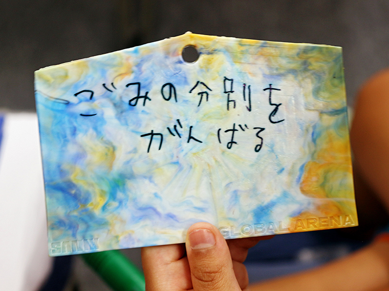 プラスチックをリサイクルして生まれた「絵馬」にゴミを減らすために、みんなが身近でできることを書いてみました。実際に書いてみると、自分事としてとらえやすくなりました。
