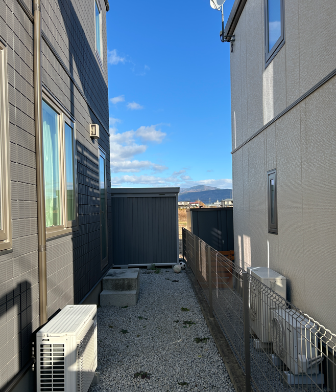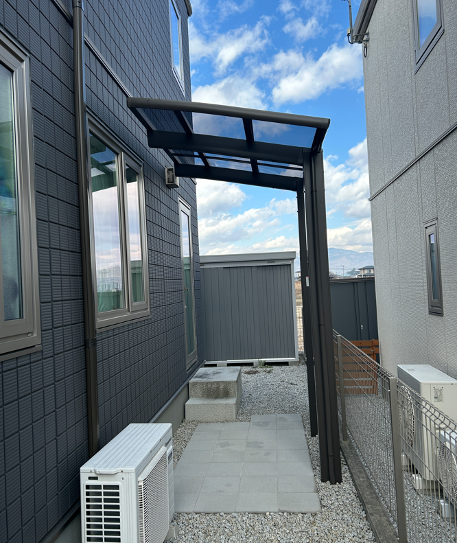 建物と建物の間の限られたスペースに合わせて、サイクルポートのサイズや形状を現地に合わせて加工し、しっかり雨を防ぎながらも圧迫感を抑えたレイアウトとしました。外壁や物置、フェンスとの位置関係を確認しながら柱位置を決め、日常の動線を妨げないよう配慮しています。