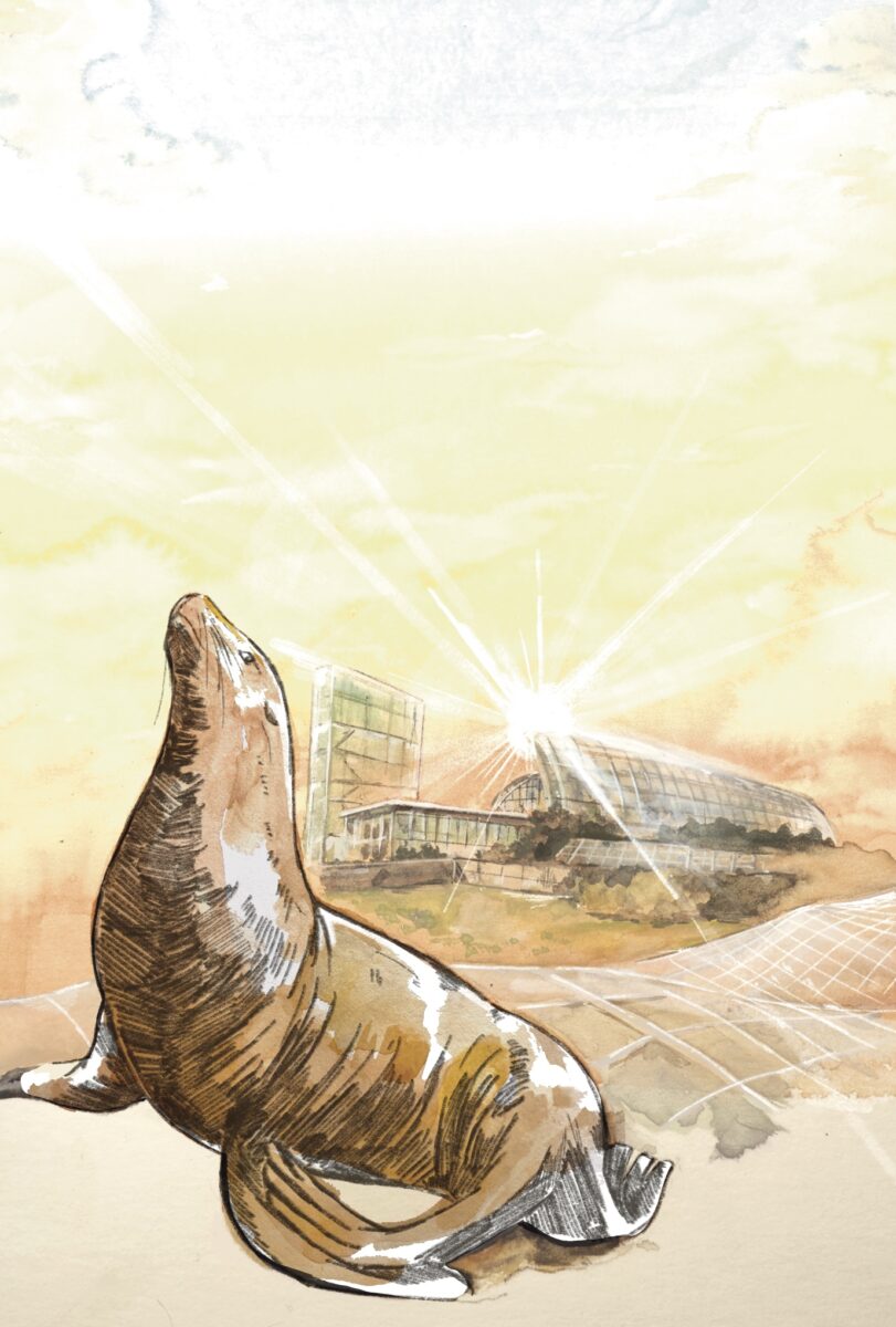 アクアマリンふくしまでは、森・川・海、様々な環境にすむ個性豊かな生き物たちを展示しています。このイラスト展では、アクアマリンふくしまで展示している生き物やこれまで展示した生き物の生態をテーマにした巨大4コマまんがが楽しめます。4コマまんがは全て今回のイラスト展のために制作されたじゅえき太郎さんの新作です。また、じゅえき太郎さんの書籍に登場するような「ゆるふわ」生物になれる顔はめパネルや写真とのコラージュ作品もあります。