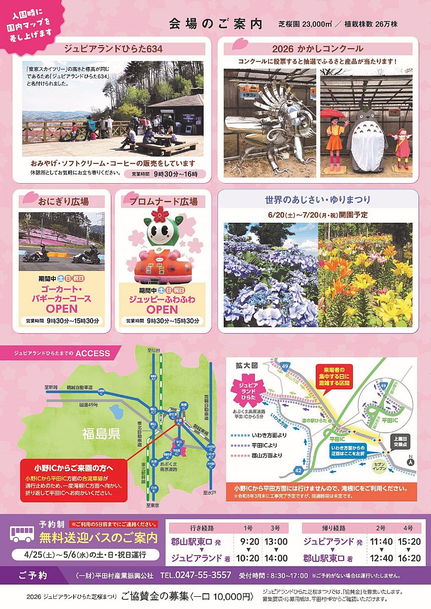 福島県石川郡平田村は、高原野菜、激辛ハバネロや自然薯で知られていますが、この季節に特に注目されるのが「ジュピアランドひらた」というレジャー施設です。村のシンボルである蓬田岳のふもとに広がる自然豊かな森林公園で、今の時期は園内をなんと約26万株の芝桜が彩ります。例年4月下旬から5月中旬にかけて「芝桜まつり」が開催され、ピンクの花々が一面に咲き、まるで花の海のような華やかな景観を満喫できます。絶景スポットとして有名で、多くの人が写真撮影に訪れます。期間中は園内で音楽ライブや飲食の出店があり、お子様向けのスタンプラリーも実施されており、家族で楽しめる催しが充実しています。さらに、満開の時期には夜のライトアップも行われ、昼間と違う雰囲気の花畑を満喫できます。