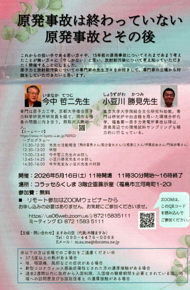 2026年5月16日(土)、原子力と放射能汚染についての専門家をお招きし、「原発事故は終わってない 原発事故とその後」を開催します。