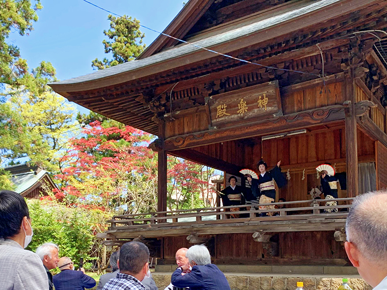 境内には樹齢1,000年を超える御神木「峰張桜(みねはりさくら)」が咲き誇り、その下で養蚕業の発展と五穀豊穣を祈る神事が執り行われる他、 神楽殿では「東山温泉芸妓屋協同組合」が奉納演舞を披露する。