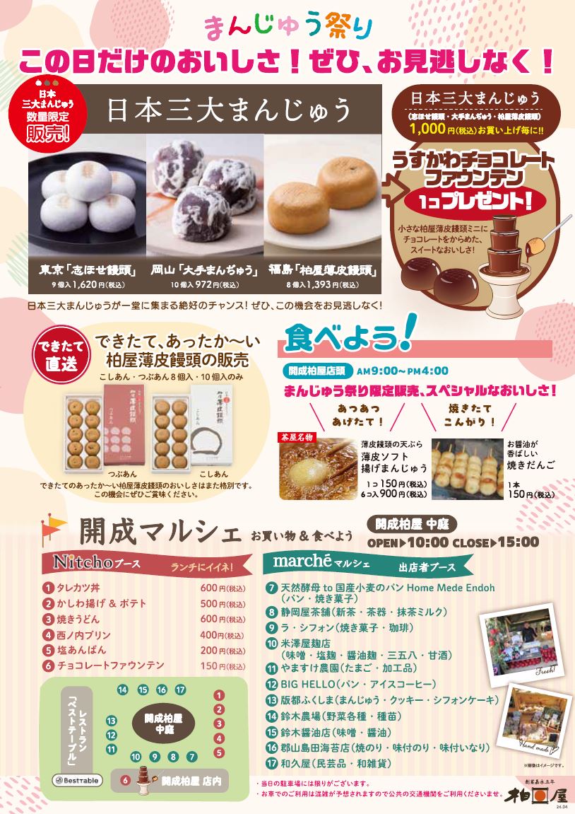 毎年恒例・開成柏屋の「まんじゅう祭り」4/19(日)午前9時から開催! 是非お楽しみください。