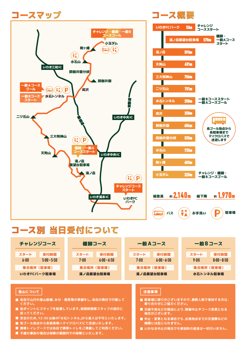 「いわき七峰縦走」は、湯ノ岳→天狗山→三大明神山→二ツ石山→閼伽井嶽→水石山→剣ヶ峰の7つのピークを巡っていわきの自然を満喫できる山岳イベントです。今年は記念の第20回になります!チャレンジコースのスタート地点を「いわきFCパーク」に延長し、最長が約30.5Kmのロングコースとなりました。低山ながら約30kmの歩きごたえのあるコースです!山頂から海を眺められる場所があり、水石山の山頂にある展望台からはいわき市全体と太平洋を見渡せる大パノラマが広がり格別の景色が楽しめます。まさに「いわきならでは」のお楽しみと言えるでしょう。参加者の体力レベルに合わせて、4つの異なるコースを用意しましたのでご自身の体力やペースに合わせて無理なくお楽しみいただけます。