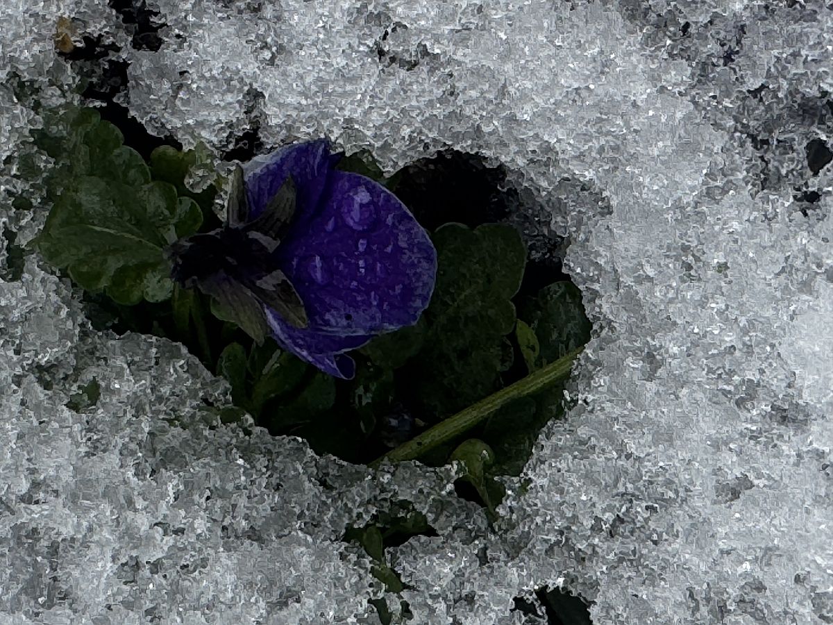 「庭に出てみたら、雪に埋もれていたクロッカスが顔をだしているのを発見。寒い雪の中がんばっていたようです。」