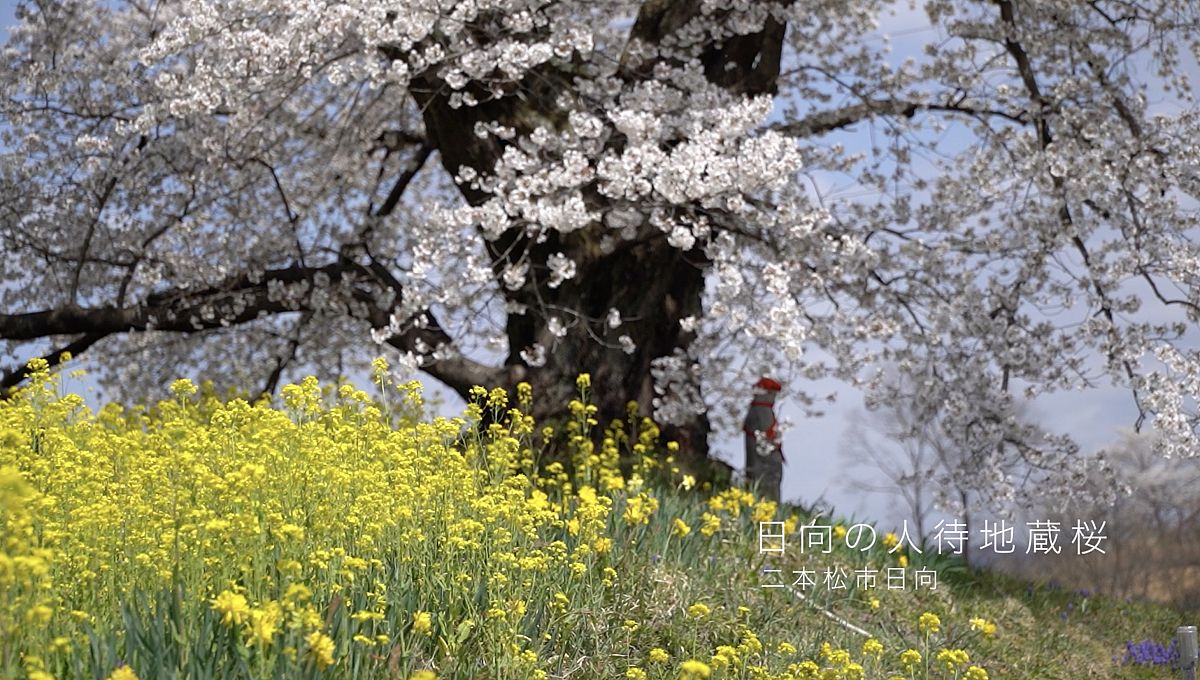 旧岩代町の峠道に立つ一本桜。人待ち地蔵桜と名付けられた桜は、小さなお地蔵様を守っている様に大きく枝を伸ばしています。木の下に佇むお地蔵様と周囲に咲く菜の花との組み合わせが美しく、写真愛好家の人気を集めています。残雪の朝日吾妻連峰を望む雄大な景色も楽しめます。