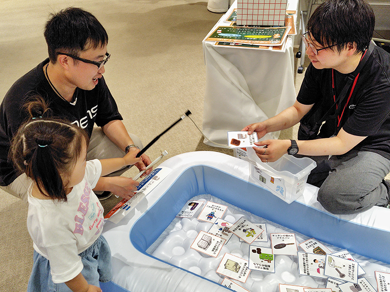 サンパイと似て非なるもの“一般廃棄物(イッパイ)”。並べたカードを専用の竿で釣って、サンパイとイッパイで仕分けしてもらいました。
