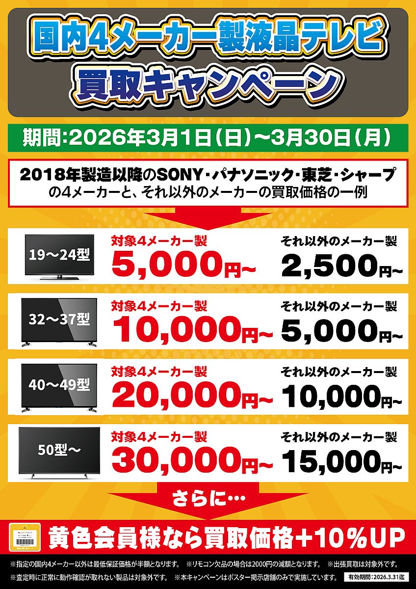 - 2026.03.23(月) 国内4メーカー製液晶テレビ買取キャンペーン!!オーディンいわき鹿島店開催!!