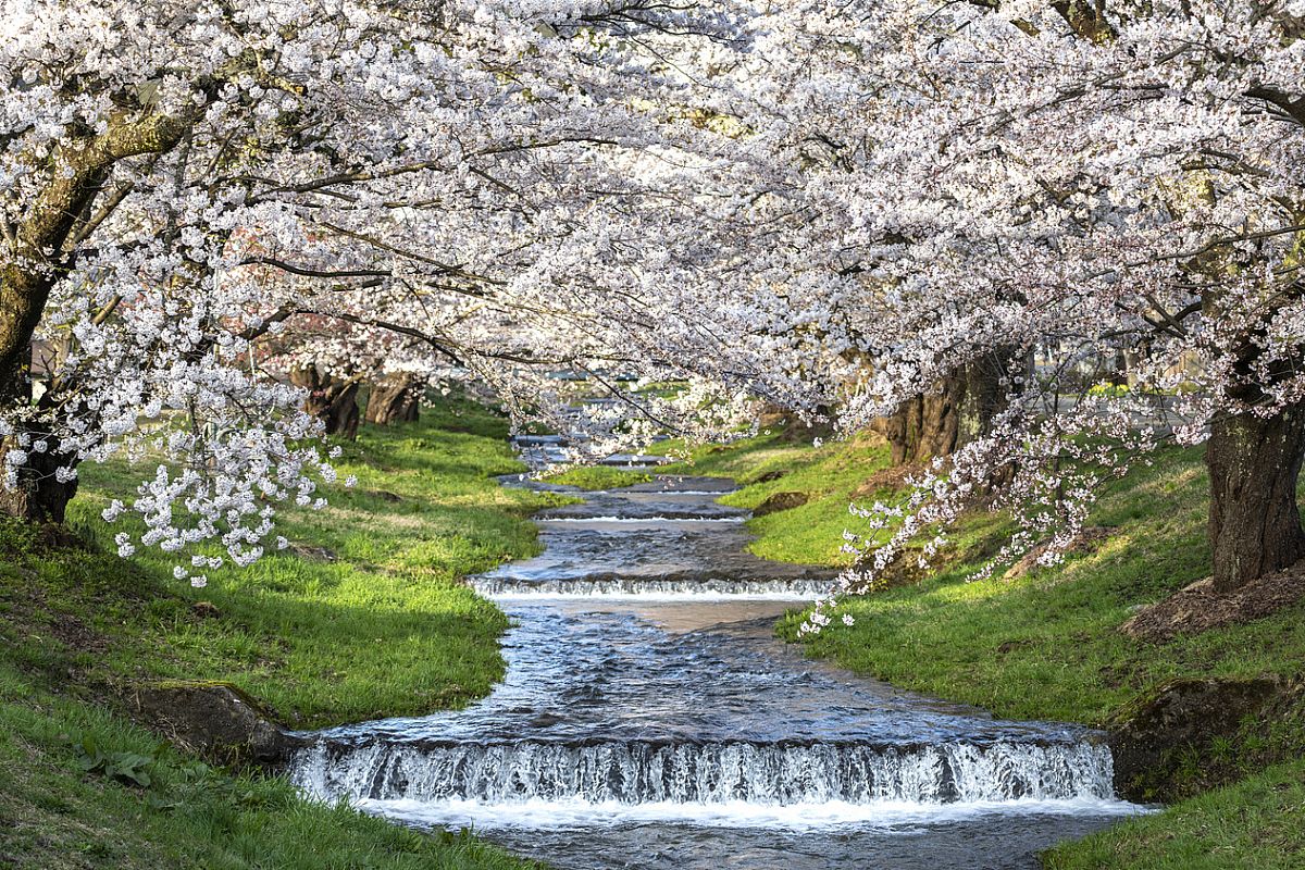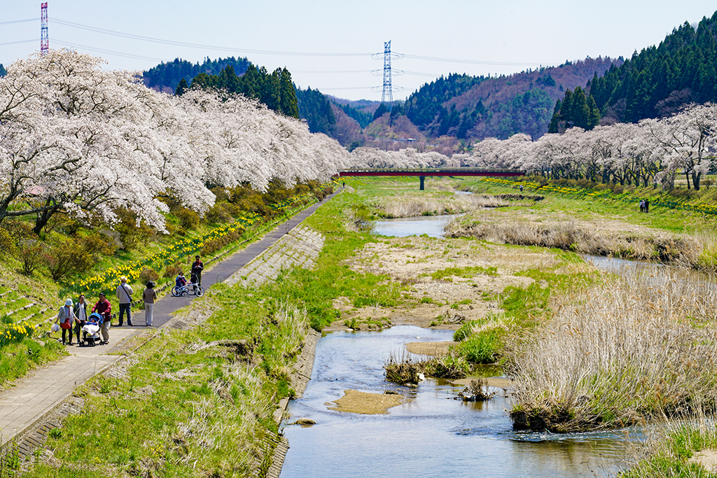 Around 1,000 “Somei-Yoshino” cherry trees line a five-kilometer stretch along both banks of the Natsui River. The river rises in the Abukuma Mountains and flows for 67 kilometres before reaching the Pacific Ocean. The trees were planted in 1975 as part of local land improvement and river restoration efforts. You can enjoy the sakura avenue from the riverside walking paths, while the view from the Ban-etsu Expressway offers a sweeping perspective of the entire scene.