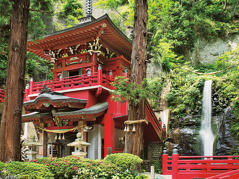 奥の院は、朱塗りの「大日堂」と「不動滝」が象徴的。三十六童子を祀る洞窟は、迷路のように続き、ろうそくの灯りを手に巡れば、厳かな空気の中でご利益を授かれそうだ