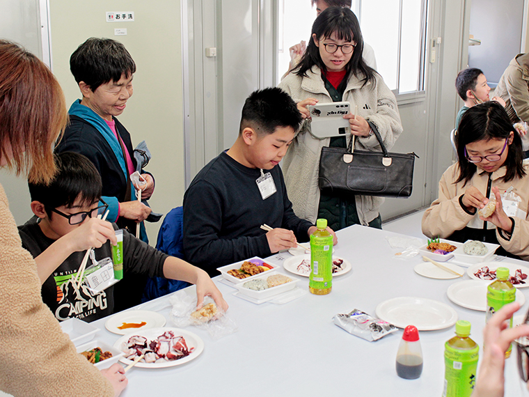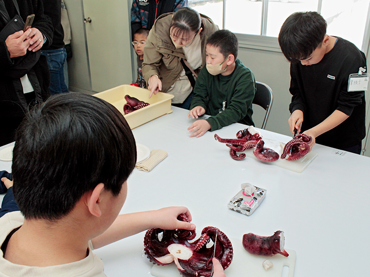 「生きているタコを触るのは初めて!」というお子さんも多く、机に張り付く活きが良いタコに悪戦苦闘しながら進めていました。