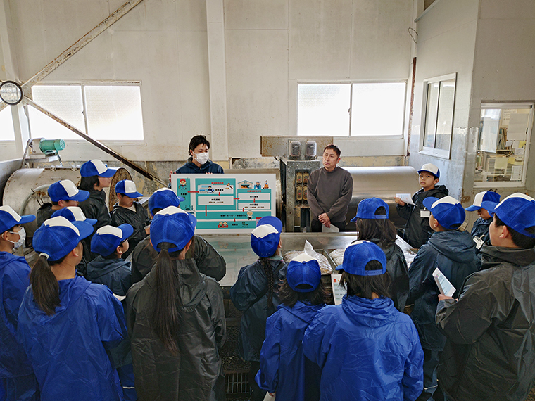 次に、タコの加工品を作る「カネセン水産」へ。100kgものタコを一度に塩もみできる機械や大きな茹で釜を興味深そうに見学していました。