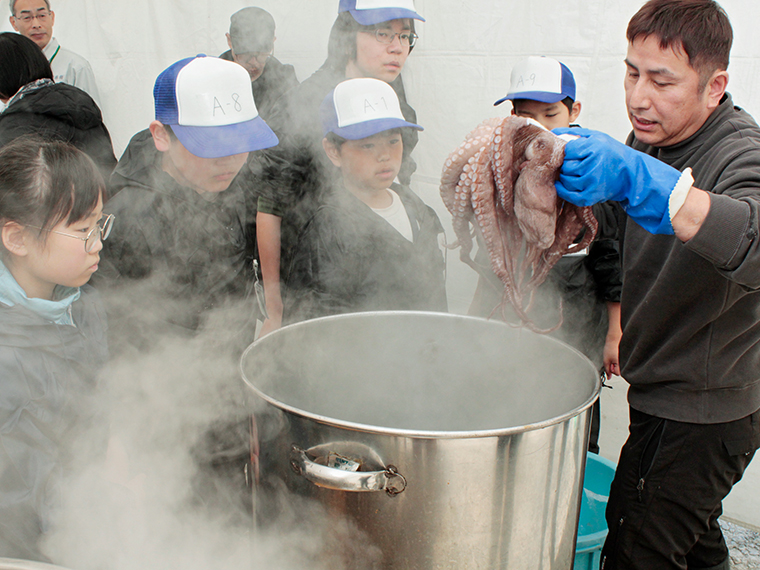 茹でていると、タコの良い香りが広がってきます。「福島のタコは茹でると良い香りがするんですよ」とカネセン水産の坂本さん。