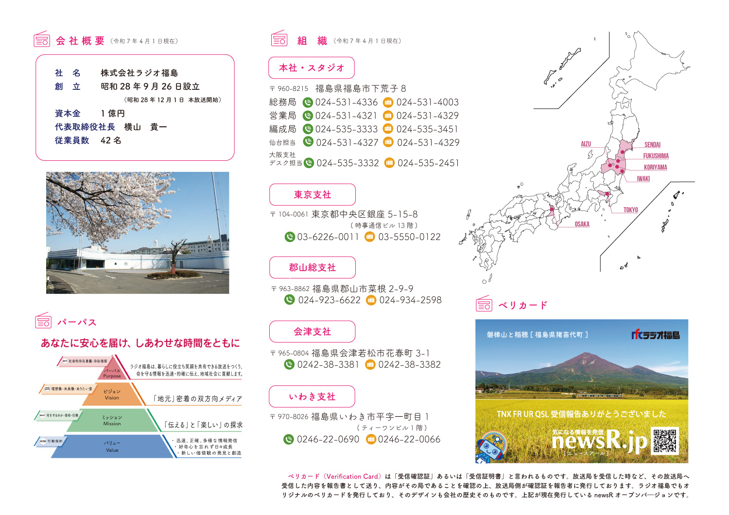 弊社は、福島県を放送エリアとするAMラジオ放送局で、2023年12月1日、開局70周年を迎えました。 地域に根ざし信頼される放送局を目指し、ワイドFMとAMのサイマル放送で、朝から夕方まで4つの生ワイド番組を中心に 暮らしに役立つ情報をお届けしています。 また、放送とホームページ、SNSなど通信との連携を積極的に行っています。