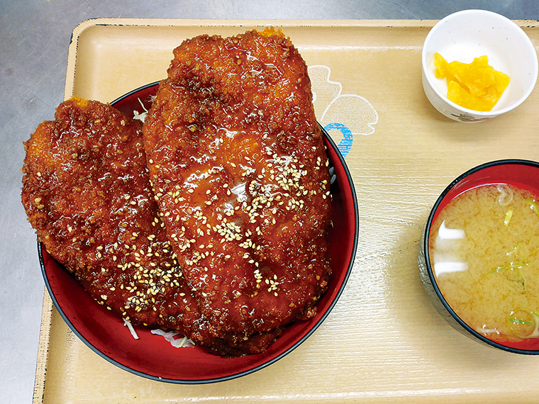 道の駅おすすめのメニューは、わらじのような大きな豚ロースのトンカツが2枚のった「わらじソースカツ丼」。ご飯は地元のひとめぼれを使用する。特製ソースが味の決め手。