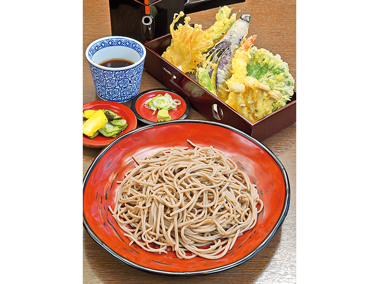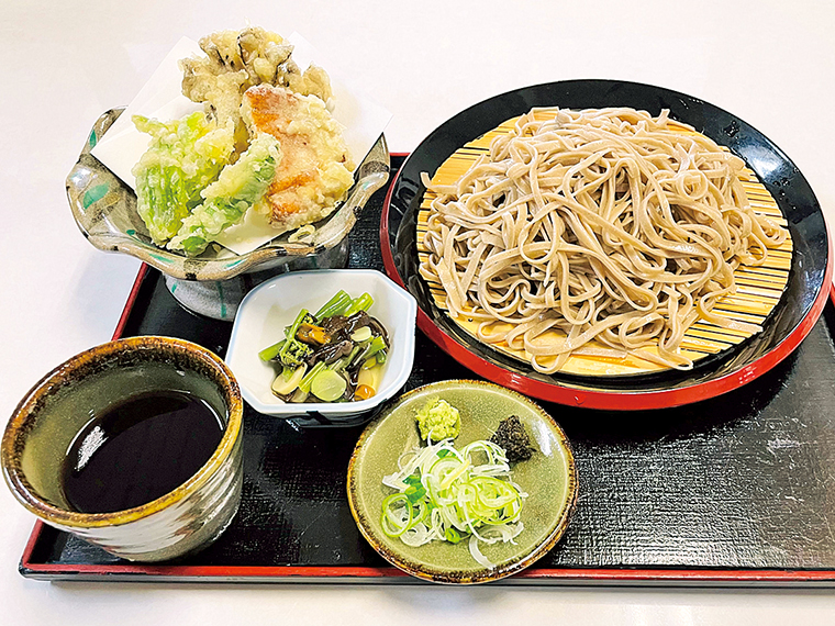 標高862mにあり、南会津の雄大な山並みを眺望できる『道の駅 しもごう Ematto(エマット)』。食事処では猿楽台地のそば粉を使った、つなぎなしの十割そばを楽しめる。地元の旬野菜をカラッと揚げた天ぷらが付く。
