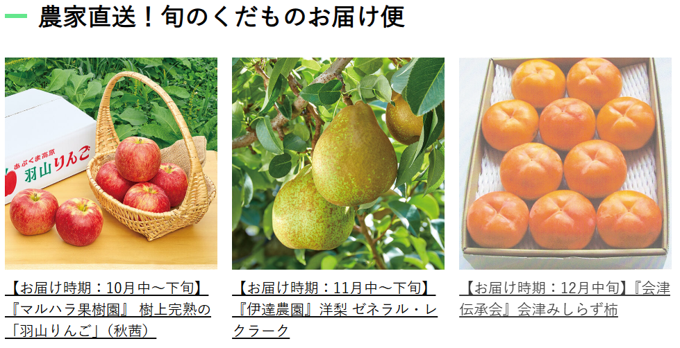 1回のご注文で、月替わりで自宅へ商品をお届けする月替わり定期便。10月は二本松市『マルハラ果樹園』のリンゴ、11月は伊達市『伊達農園』の洋梨、12月は会津若松市の『会津伝承会』のみしらず柿をお届け!